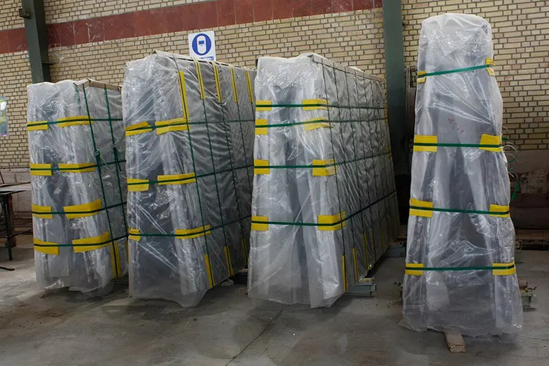 After the slabs are securely placed in the metal bundle, a thick stretch film is wrapped around the load. Then, heat-based shrink wrapping is applied to seal the bundle completely and protect it from dust and moisture. - Professional Strapping