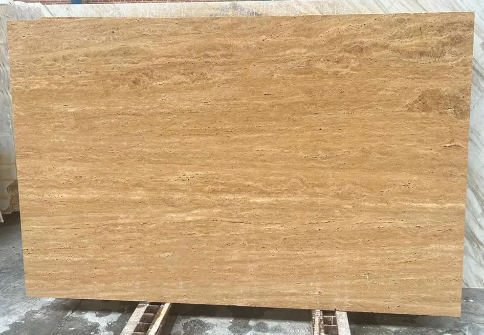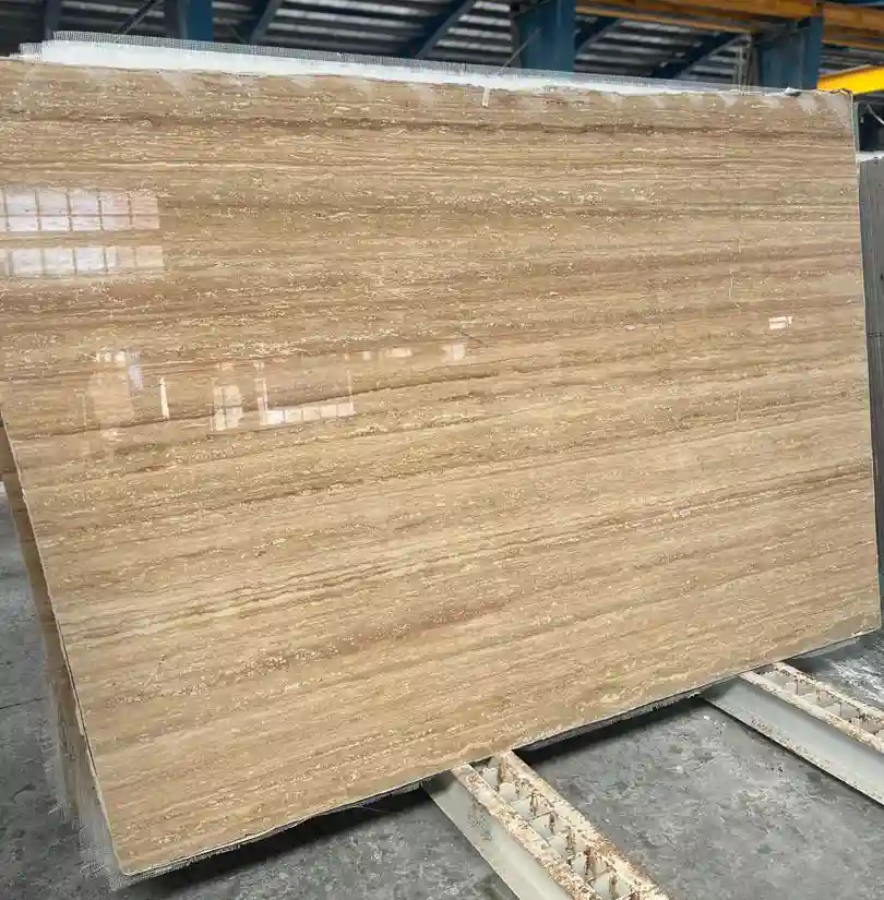 Beige Travertine Vein Cut Polished is a refined natural stone that showcases linear patterns of cream and beige tones. The polished finish highlights the natural veining and offers a smooth, shiny surface suitable for luxury interiors. This type is ideal for wall panels, indoor floors, and lobbies.