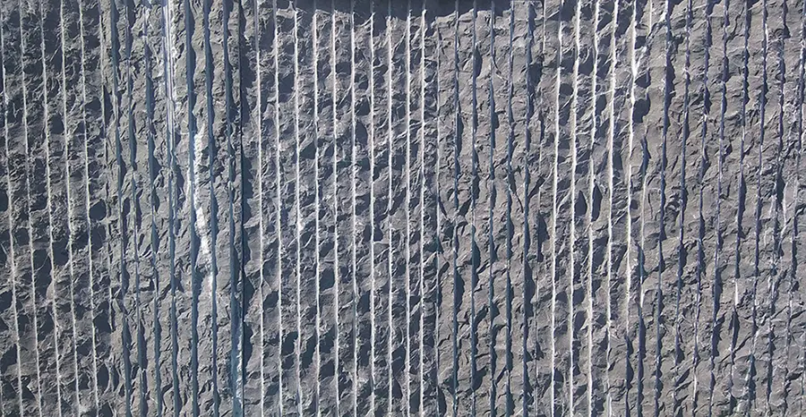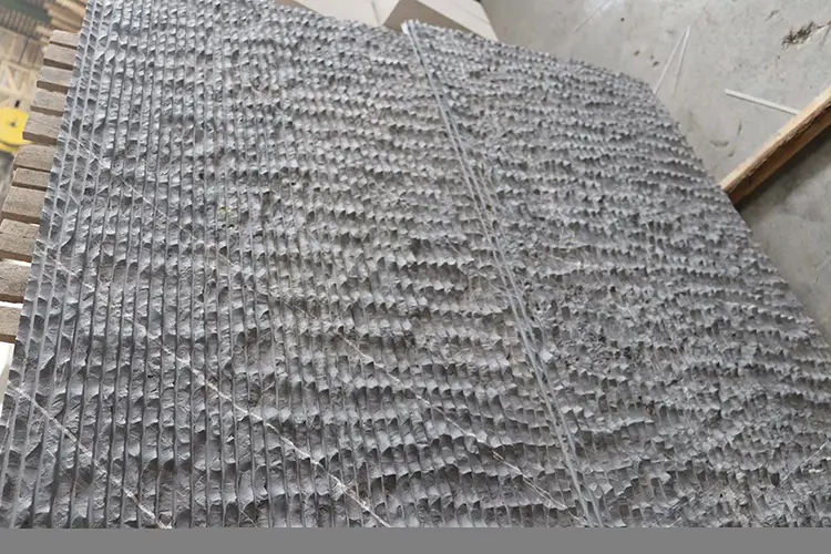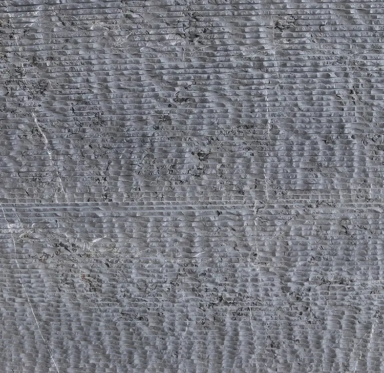 Pietra Grey Marble with a cut broken finish blends modern precision with rustic character. This finish involves machine-cut parallel grooves followed by hand-breaking the space between the grooves. The result is a surface with a dynamic, fractured texture that retains the marble’s natural appeal while adding visual interest and depth—perfect for facades and bold interior design.